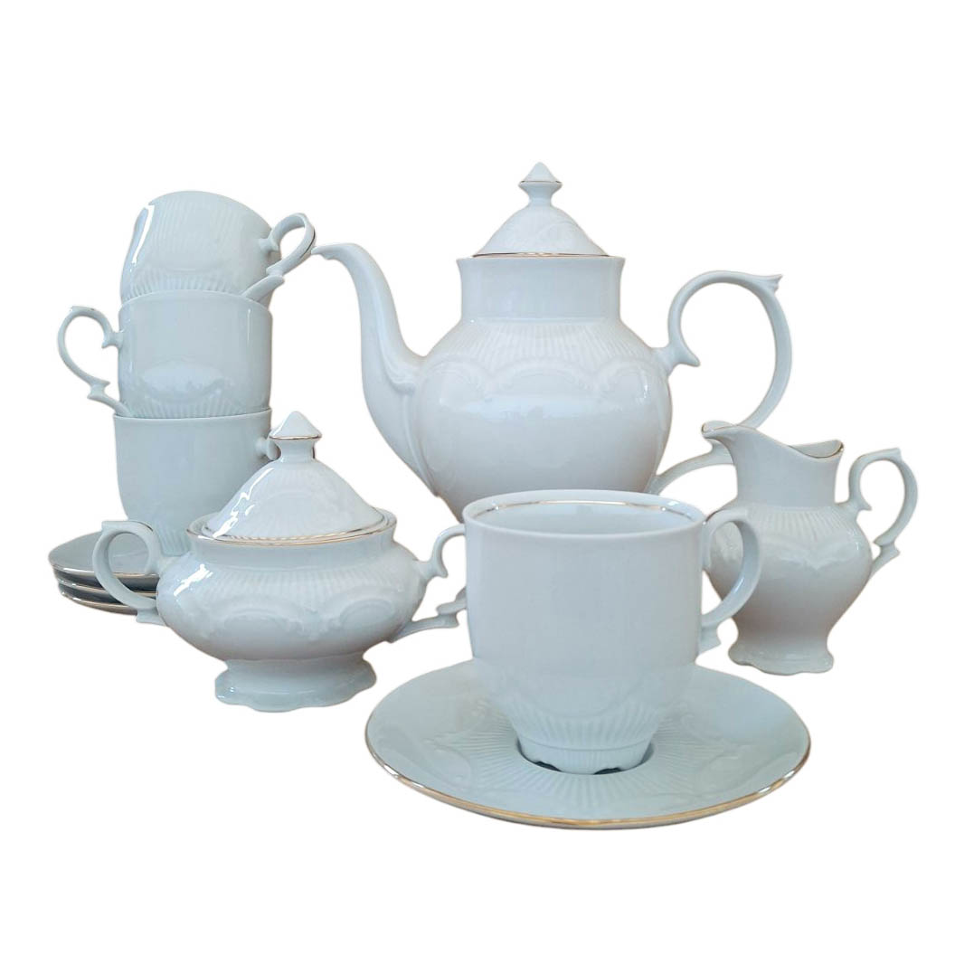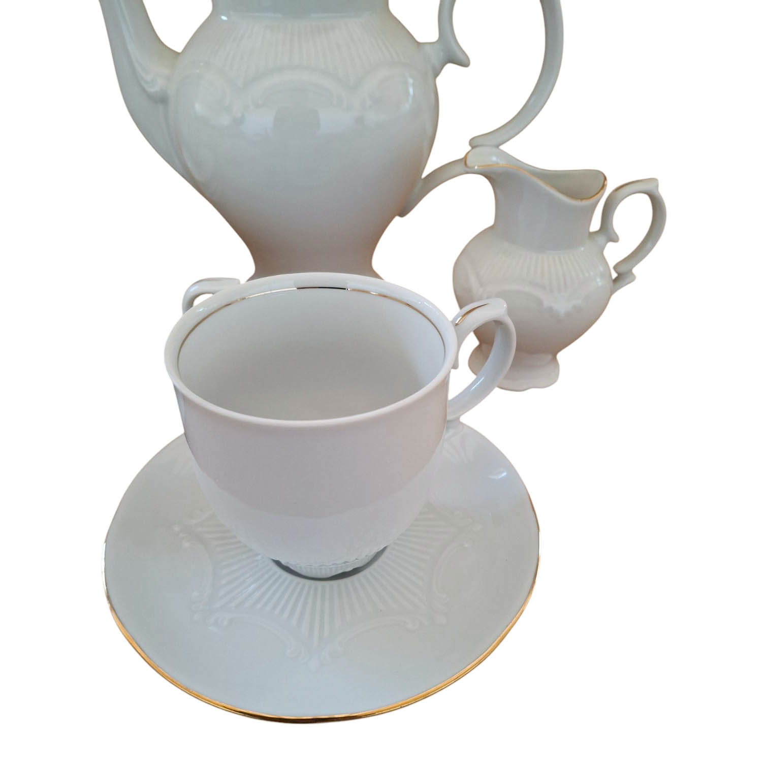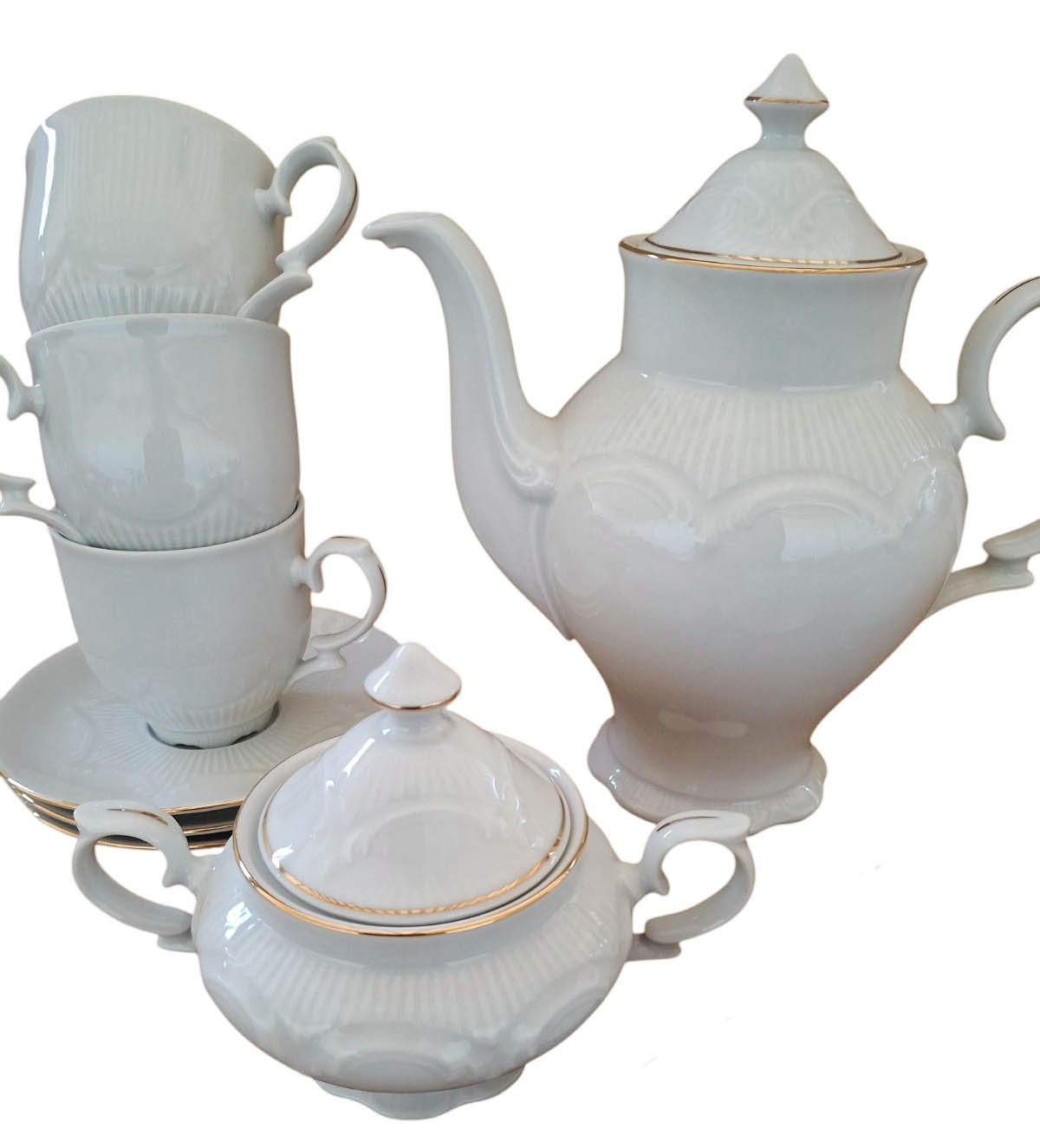 Ένα μοντέρνο και ταυτόχρονα διαχρονικό σετ τσαγιού, από ολόλευκη πορσελάνη Βοημίας υψηλής ποιότητας, με ανάγλυφη τελειότητα και επίχρυση διακόσμηση 24Κ.